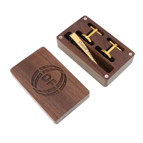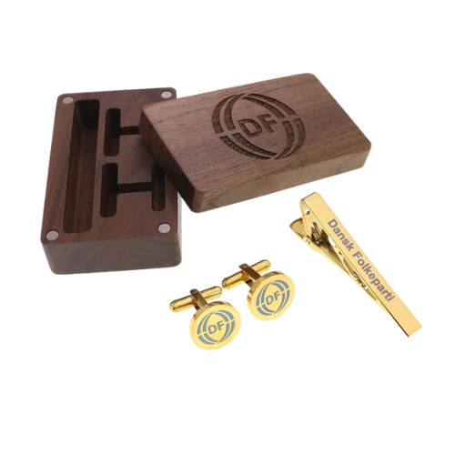 Et klassisk og stilfuldt herresæt, der forener elegant design med et tydeligt politisk statement. Sættet består af en slipsenål og et par manchetknapper, begge udført i forgyldt rustfrit stål og prydet med Dansk Folkepartis logo. Det hele leveres i en eksklusiv trææske med logo, som fuldender det gennemførte udtryk.