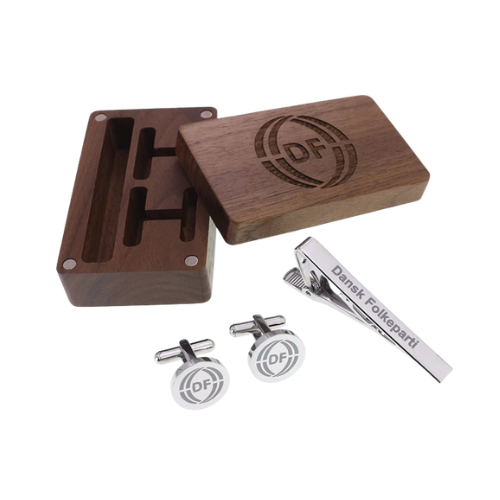 Et klassisk og stilfuldt herresæt, der forener elegant design med et tydeligt politisk statement. Sættet består af en slipsenål og et par manchetknapper, begge udført i rustfrit stål og prydet med Dansk Folkepartis logo. Det hele leveres i en eksklusiv trææske med logo, som fuldender det gennemførte udtryk.